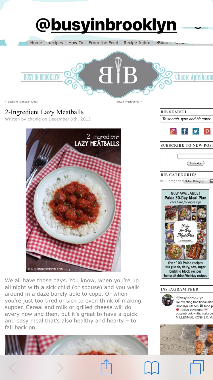 - 2-Ingredient Lazy Meatballs from Busy in Brooklyn – This recipe is SO easy and fast! I ate mine with spaghetti squash and my kids ate it over quinoa. You could of course also make it with zucchini noodles or Manishevitz makes Kosher for Pesach noodles.